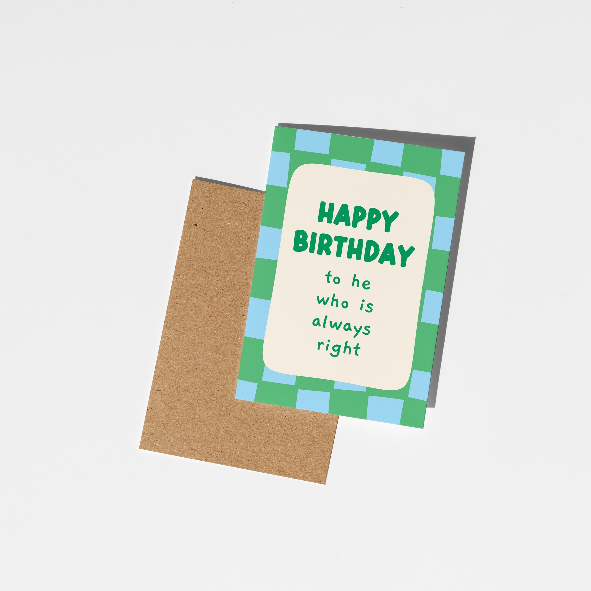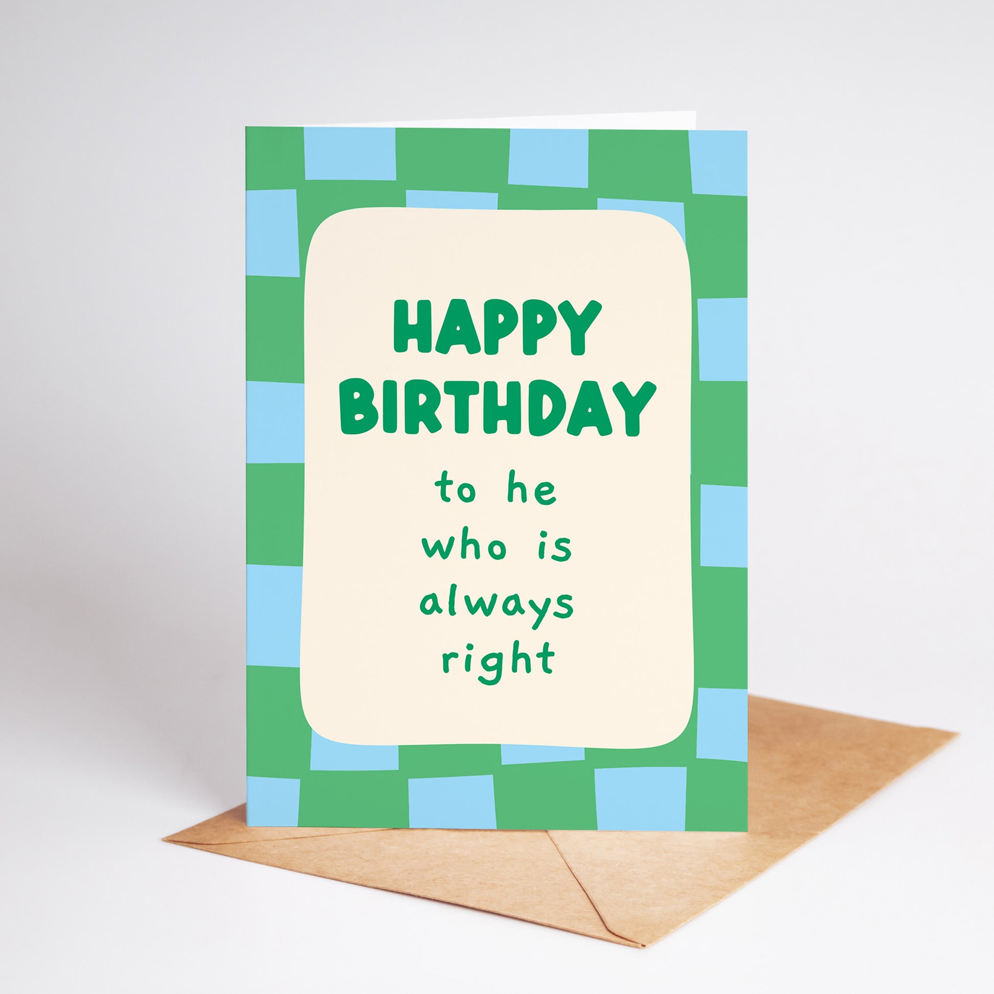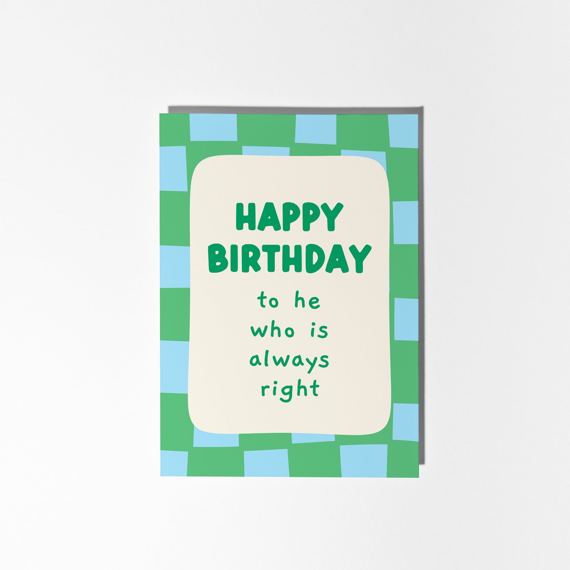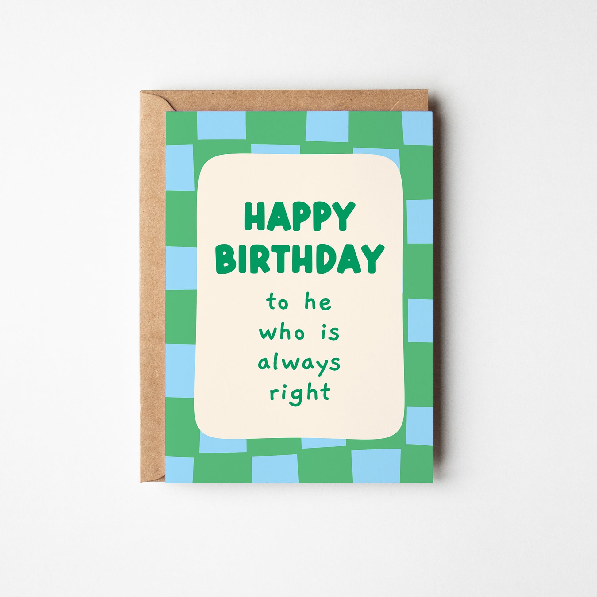 Celebrate the man who’s always right (or at least thinks he is) with this witty birthday card! Featuring the bold text, “Happy Birthday to He Who Is Always Right,” on a striking blue background, this card is perfect for husbands, dads, partners, or any confident man in your life.