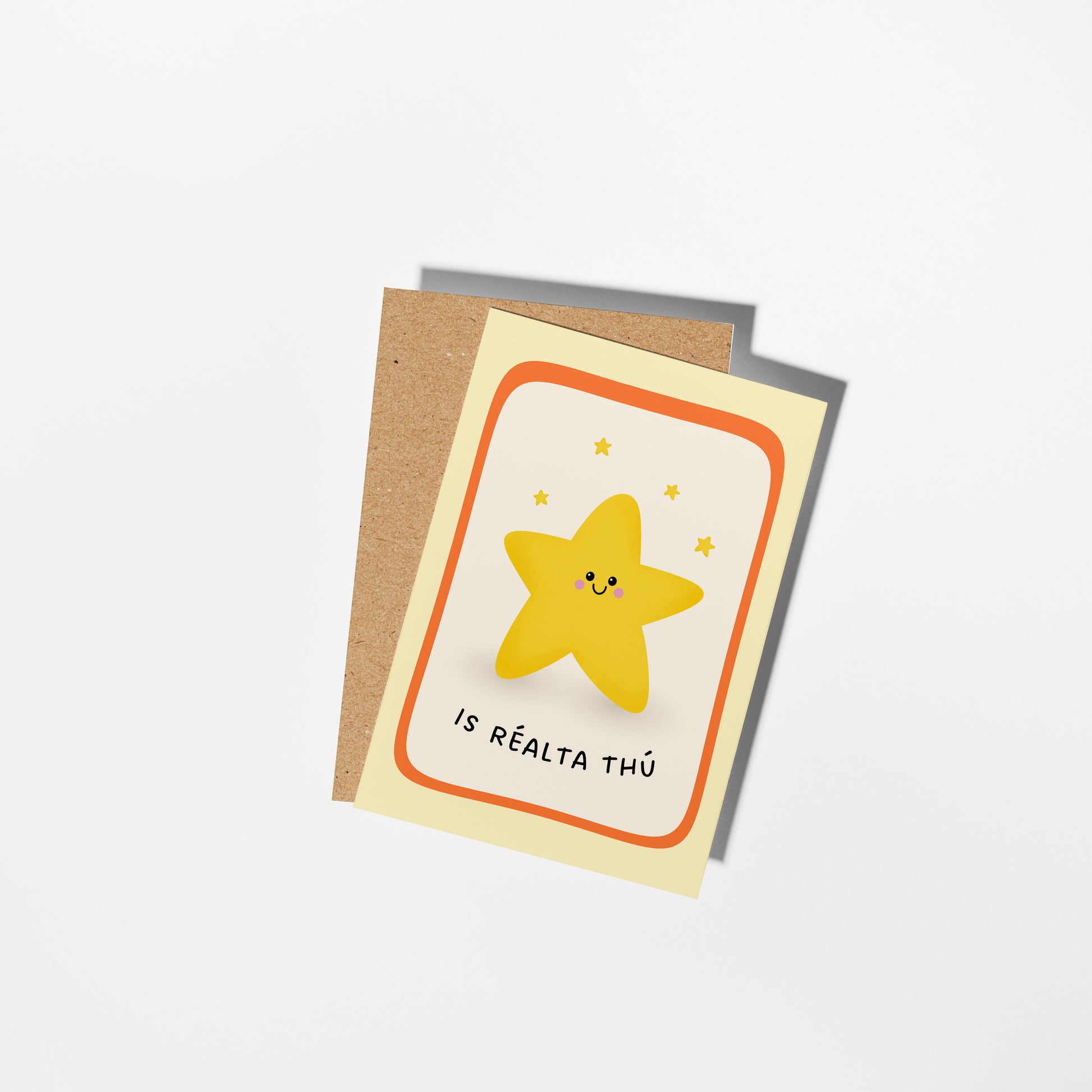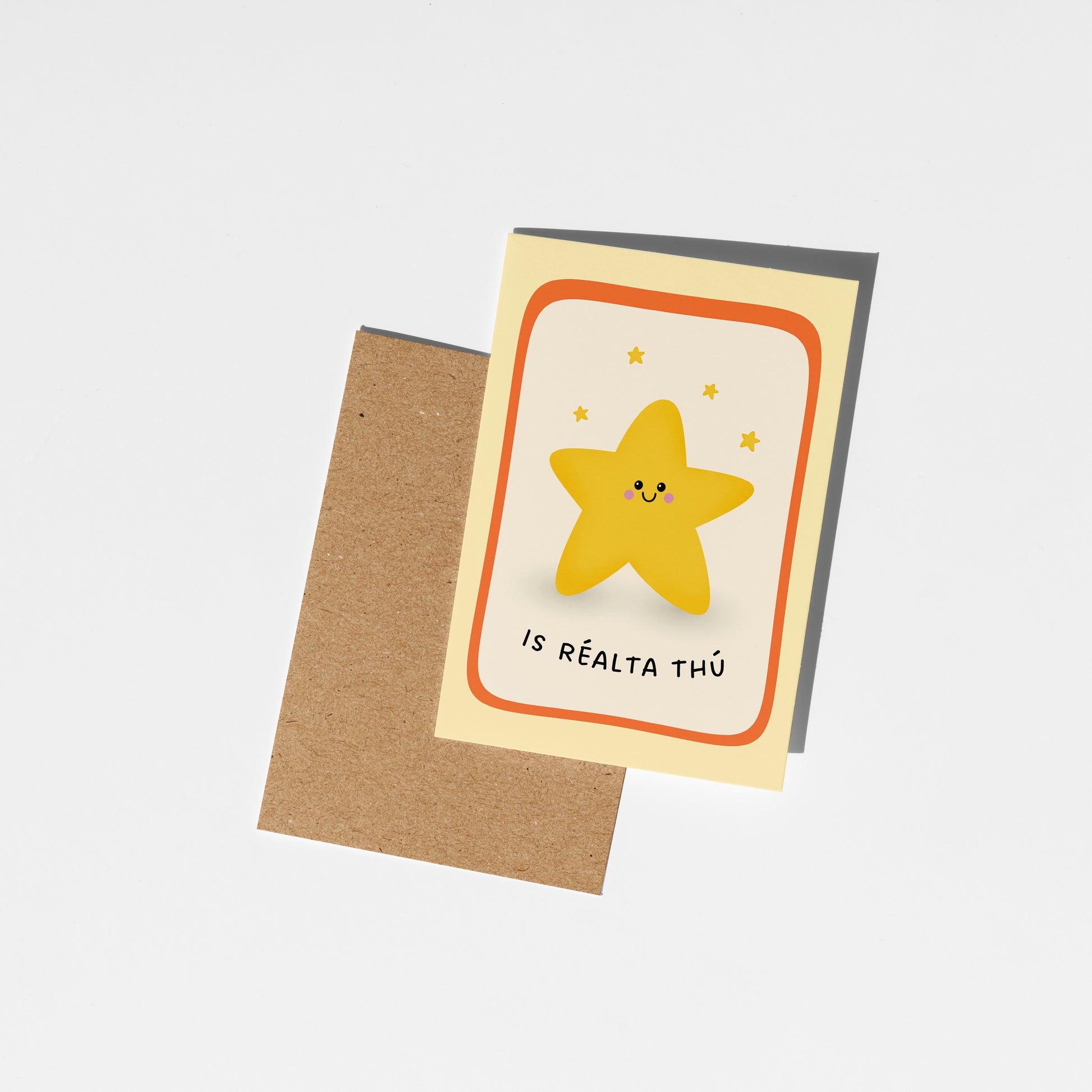 Celebrate an achievements or brighten their day with this charming Irish greeting card featuring the phrase “Is réalta thú” (You’re a star). Perfect for graduations, congratulations, a thank you card, or simply letting someone know how special they are.